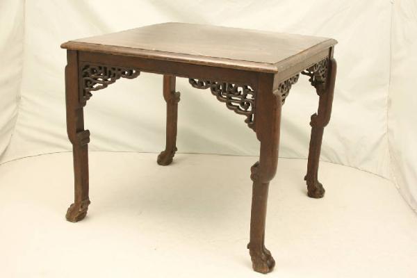 Tavolino basso in legno di teak, con gambe decorate e scolpite a zampa di leone e motivi geometrici a intaglio.