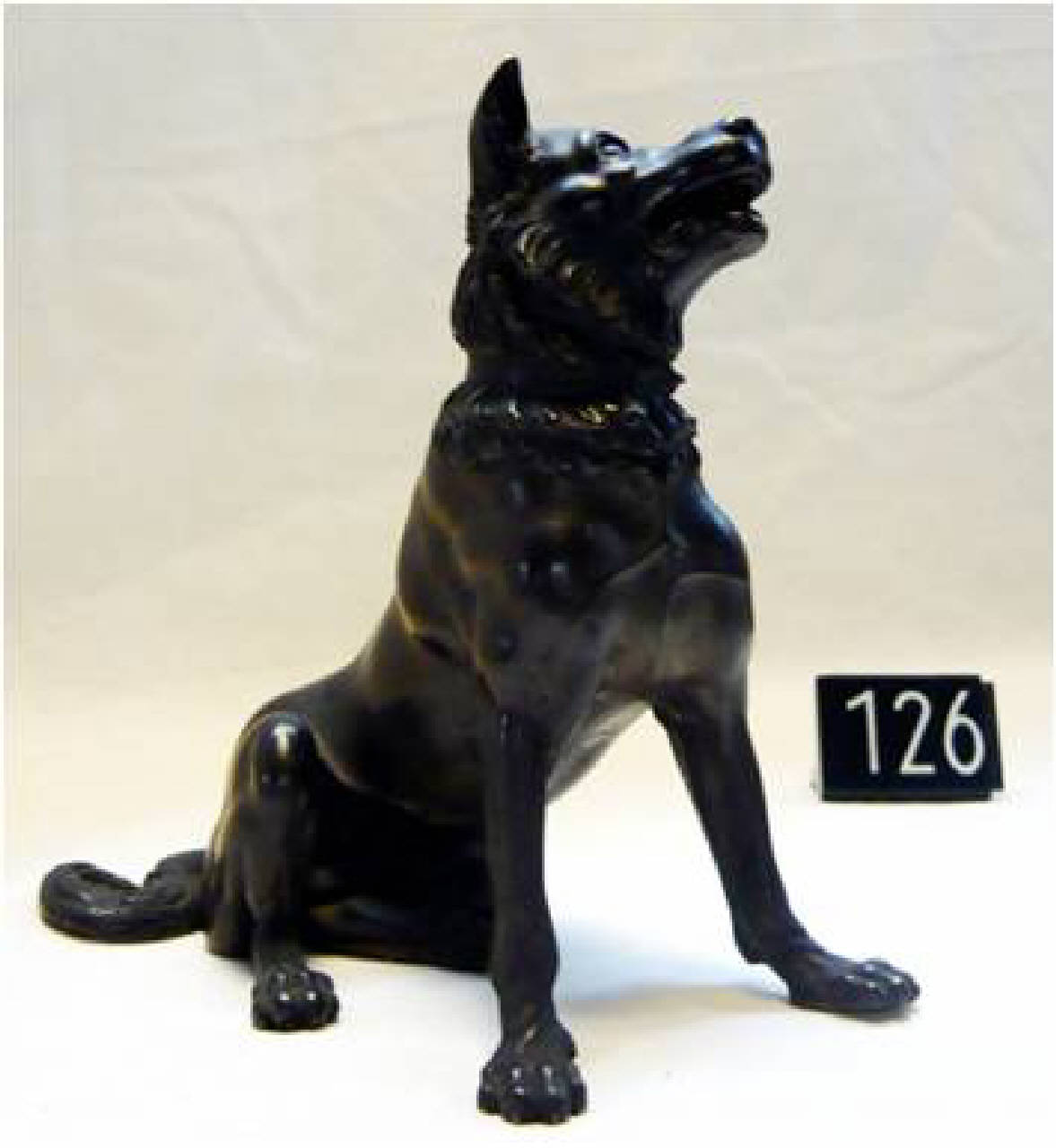 Sculturina di cane ritratto in posizione seduta, col muso voltato in alto a sinistra.