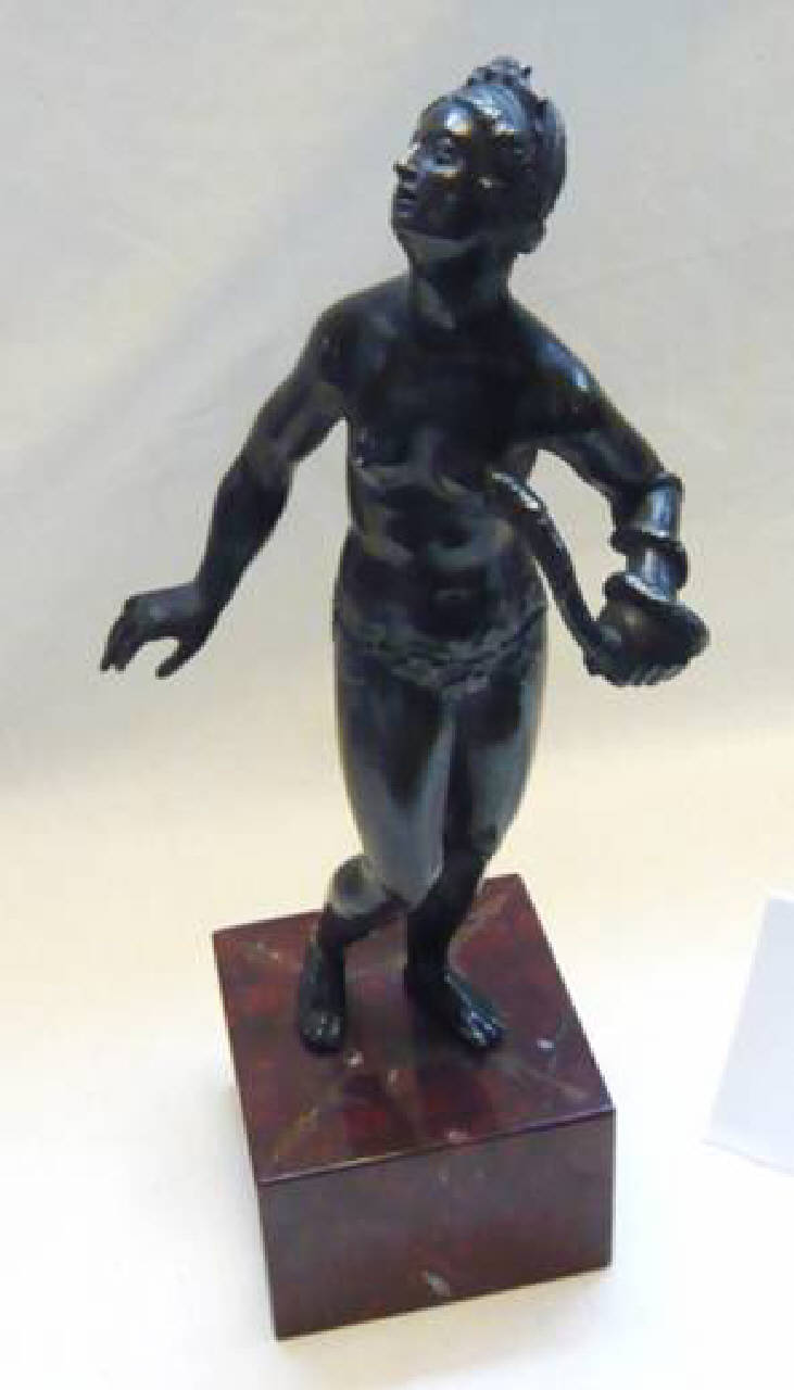 Sculturina di Cleopatra con aspide al seno su basamento. Cleopatra è nuda e stante, trattiene il serpente con la mano sinistra e volge lo sguardo verso destra.