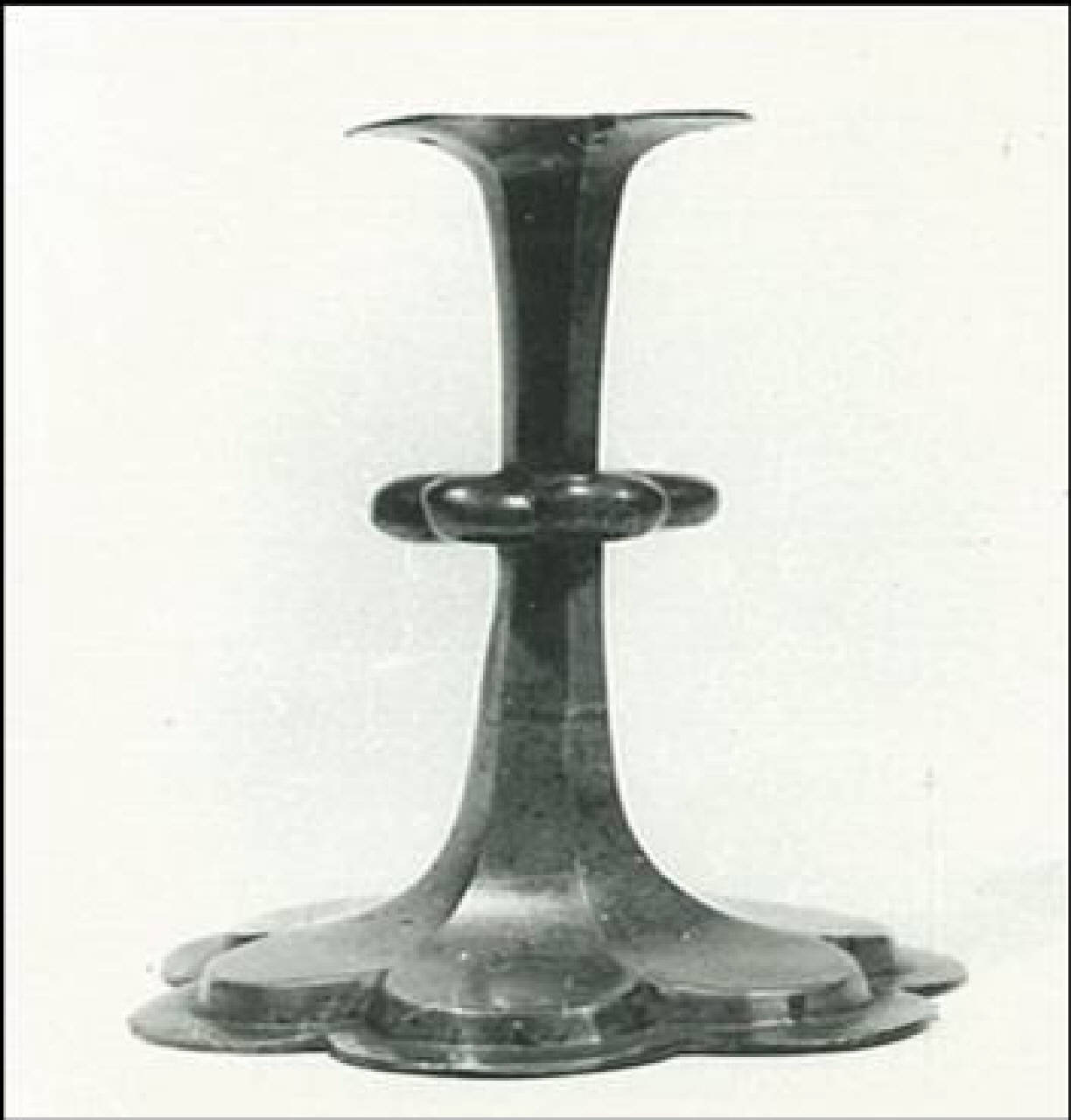 candeliere di lastra d'ottone battuta con traccia di doratura; il piede è costituito da un doppio giro di otto lobi.