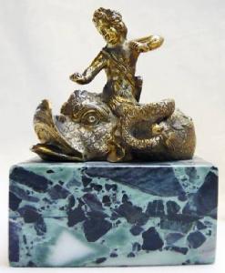 sculturina in bronzo dorato di amorino con coda di pesce sopra un delfino. L'opera poggia su una base in marmo verde. Forse si tratta di una decorazione per mobile.