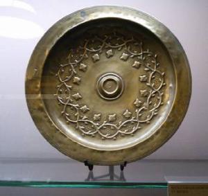 bacile in ottone brunito. Decorato a doppio ramo spinoso con fiori e foglie attorno a un clipeo centrale.