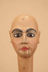 Testa in legno di tiglio con occhi di vetro. Bocca mobile con tassello dietro la nuca per la realizzazione del meccanismo.