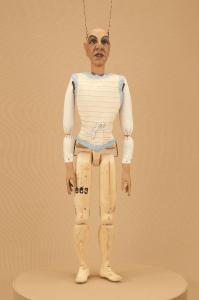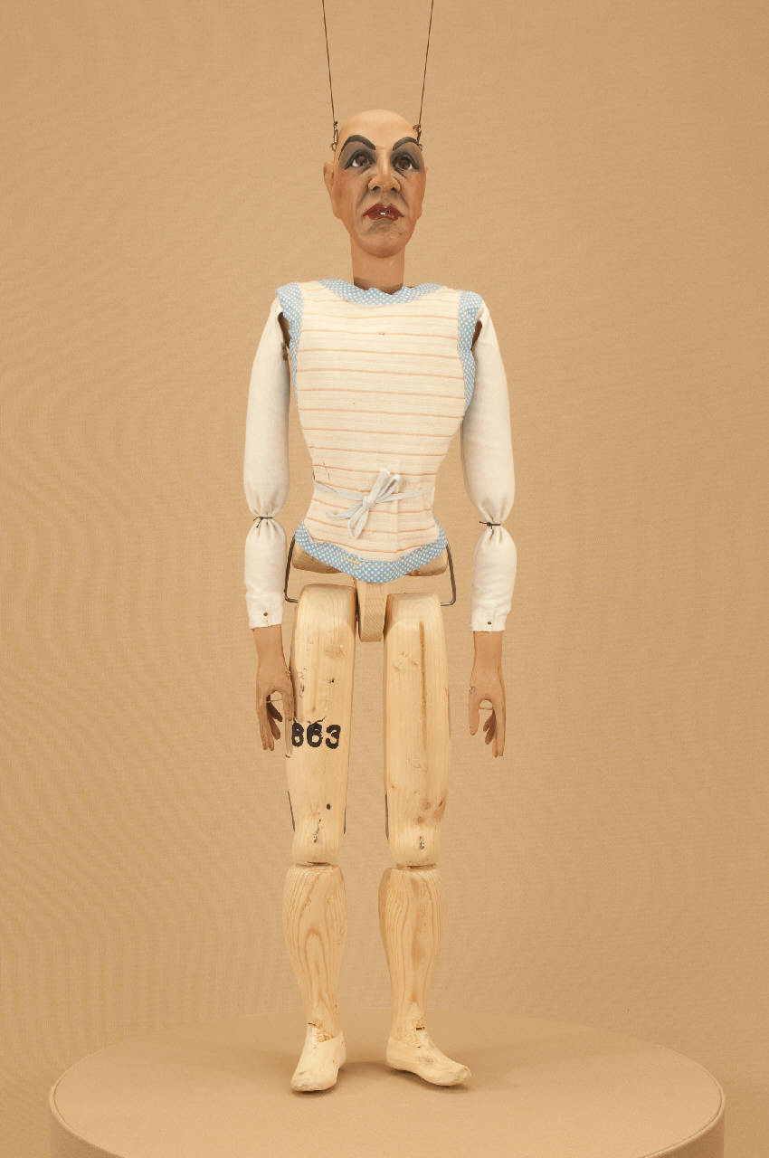 Testa di legno di tiglio fissata al corpo tramite ferro, occhi di vetro. Corpo grande in abete. Gambe unite al bacino tramite bordione in ferro, ginocchia ad incastro mobile. Mani in tiglio con dita scolpite e separate.