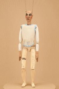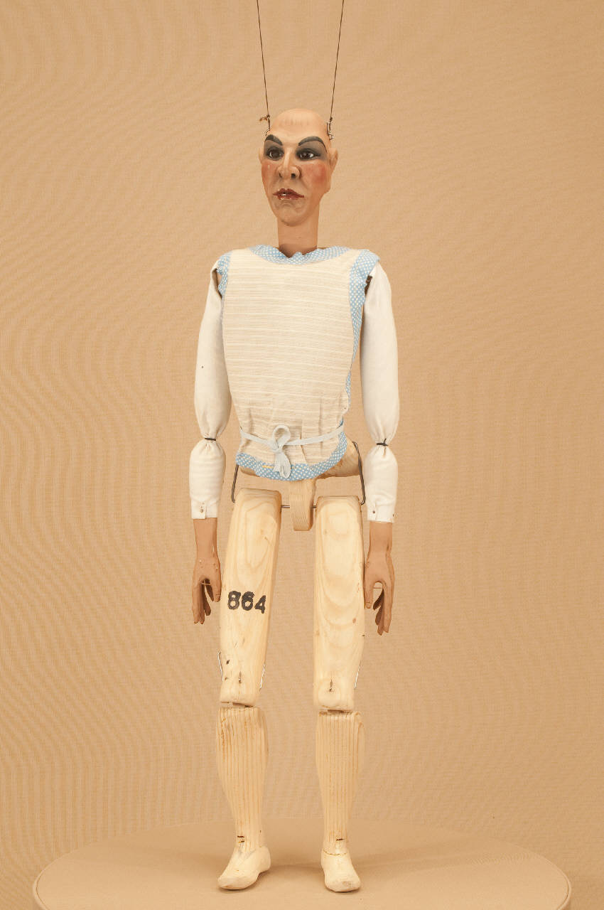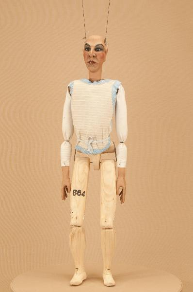 Testa di legno di tiglio fissata al corpo tramite ferro, occhi di vetro. Corpo grande in abete. Gambe unite al bacino tramite bordione in ferro, ginocchia ad incastro mobile. Mani in tiglio con dita scolpite e separate.