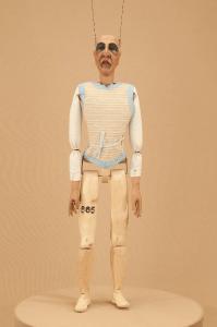 Testa di legno di tiglio fissata al corpo tramite ferro, occhi di vetro. Corpo grande in abete. Gambe unite al bacino tramite bordione in ferro, ginocchia ad incastro mobile. Mani in tiglio con dita scolpite e separate.