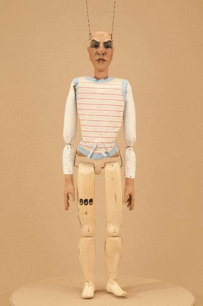 Testa di legno di tiglio fissata al corpo tramite ferro, occhi di vetro. Corpo grande in abete. Gambe unite al bacino tramite bordione in ferro, ginocchia ad incastro mobile. Mani in tiglio con dita scolpite e separate.