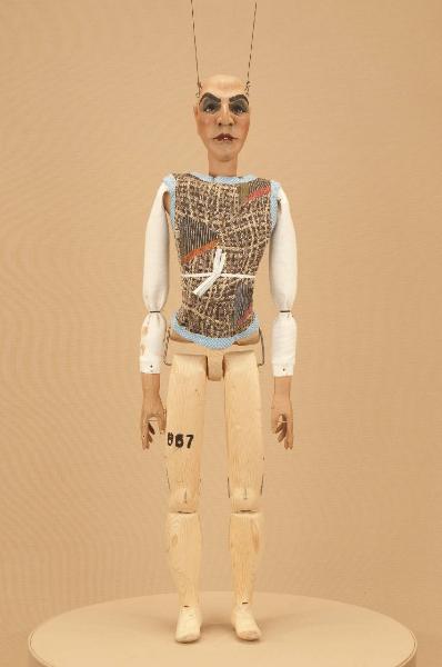 Testa di legno di tiglio fissata al corpo tramite ferro, occhi di vetro. Corpo grande in abete. Gambe unite al bacino tramite bordione in ferro, ginocchia ad incastro mobile. Mani in tiglio con dita scolpite e separate.