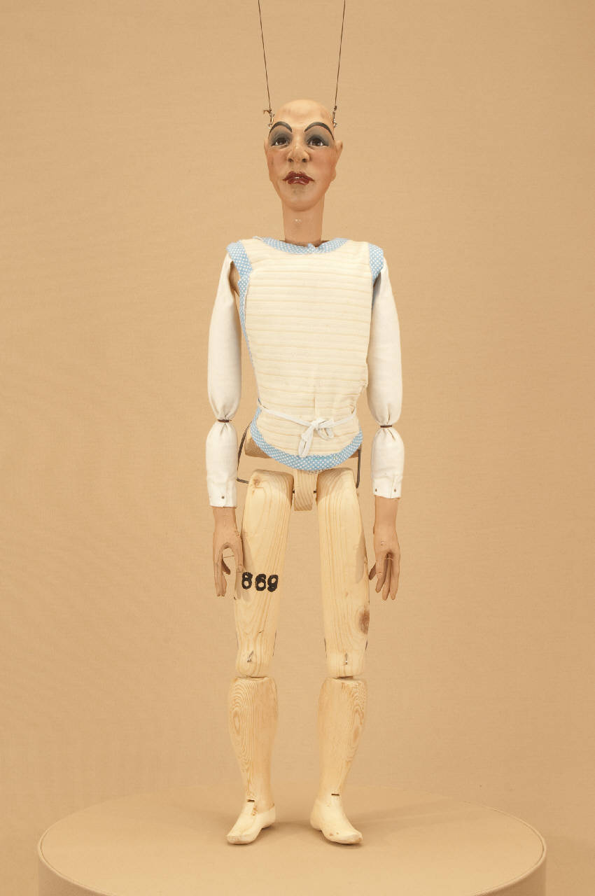 Testa di legno di tiglio fissata al corpo tramite ferro, occhi di vetro. Corpo grande in abete. Gambe unite al bacino tramite bordione in ferro, ginocchia ad incastro mobile. Mani in tiglio con dita scolpite e separate.