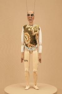 Testa di legno di tiglio fissata al corpo tramite ferro, occhi di vetro. Corpo grande in abete. Gambe unite al bacino tramite bordione in ferro, ginocchia ad incastro mobile. Mani in tiglio con dita scolpite e separate.