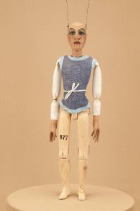 Testa in legno di tiglio fissata al corpo tramite ferro, occhi di vetro. Bocca mobile. Corpo normale in abete. Gambe unite al bacino tramite bordione in ferro, ginocchia ad incastro mobile. Mani in tiglio con dita scolpite e separate. Bilancino a croce metodo Holden.