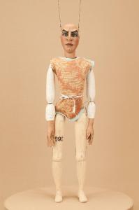 Testa di legno di tiglio fissata al corpo tramite ferro, occhi di vetro. Corpo normale in abete. Gambe unite al bacino tramite bordione in ferro, ginocchia ad incastro mobile. Mani in tiglio con dita scolpite e separate.