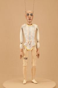 Testa di legno di tiglio fissata al corpo tramite ferro, occhi di vetro. Corpo normale in abete. Gambe unite al bacino tramite bordione in ferro, ginocchia ad incastro mobile. Mani in tiglio con dita scolpite e separate. Bilancino a croce metodo Holden.