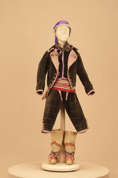 Costume da popolano di foggia ottocentesca composto da pantaloni, giacca, gilet, fazzoletto da collo, fascia, reticella e ciocie.