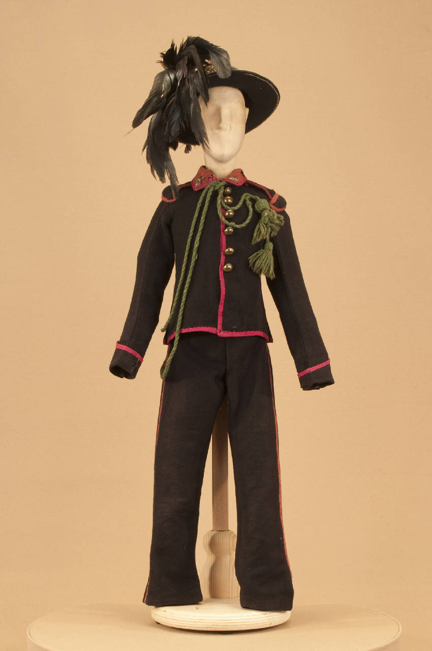 Costume militare da bersagliere composto da pantaloni, giacca, cappello e cordone.