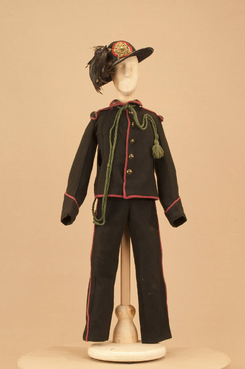 Costume militare da bersagliere composto da pantaloni, giacca, cappello e cordone.