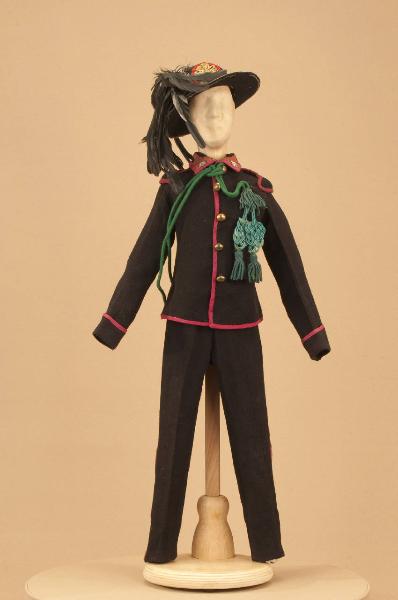 Costume militare da bersagliere composto da pantaloni, giacca, cappello e cordone.