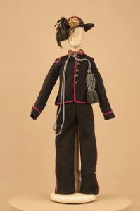 - NOTIZIE STORICO CRITICHE Il costume si completa con collo militare, polsi, ghette e buffetterie.\nGli spettacoli della Compagnia Carlo Colla che trattano il tema del brigantaggio nell¿Italia settentrionale e meridionale, erano in repertorio già dal 1863, come si evince dal libro mastro 1863-1879. I titoli erano "Majno della Spinetta", "I misteri del brigantaggio" e "I briganti della Callabria"(sic). Nel 1904 quest¿ultimo diventa "Caruso e i suoi briganti". Da questo spettacolo traggono origine nel 1907 l¿azione coreografica in 7 quadri "L¿umile eroe" con la musica di Corrado Gualtieri e nel 1918 "L¿asino e il Curato", commedia in due atti, entrambe a firma di Carlo II Colla.\nIl ballo "storico patriottico" "L¿umile eroe" rientra nei progetti di informazione sugli episodi storici che caratterizzarono la seconda metà dell¿800, tema trattato da tutte le compagnie marionettistiche di giro. Ad esso si affiancava l¿indagine sui fenomeni di trasformazione sociale che seguirono l¿età risorgimentale fra cui trova spazio il fenomeno del brigantaggio nell¿Italia settentrionale e meridionale. L¿ultima replica del ballo al Teatro Gerolamo di Milano risale al 1954.