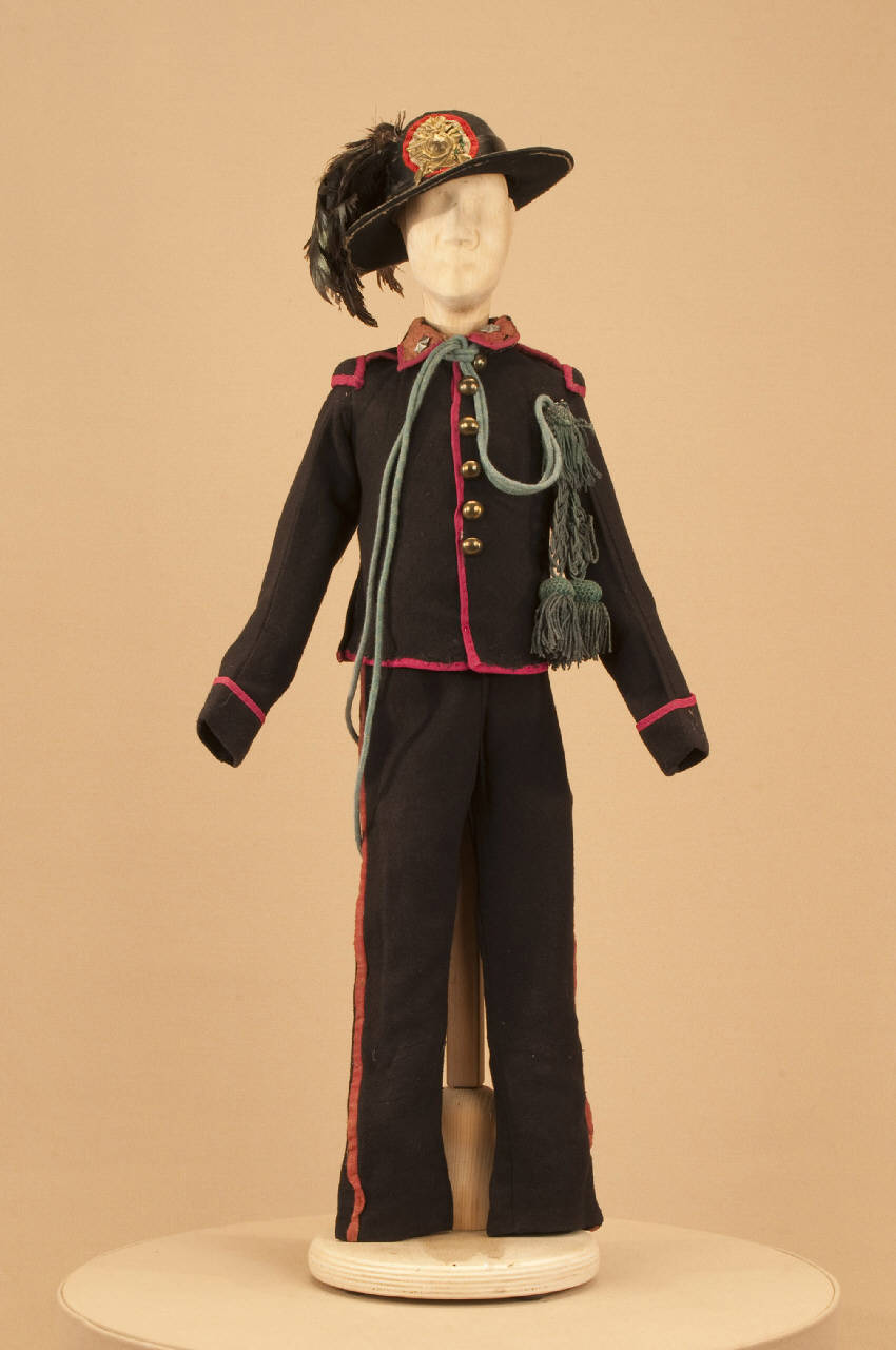Costume militare da bersagliere composto da pantaloni, giacca, cappello e cordone.