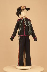- NOTIZIE STORICO CRITICHE Il costume si completa con collo militare, polsi, ghette e buffetterie.\nGli spettacoli della Compagnia Carlo Colla che trattano il tema del brigantaggio nell¿Italia settentrionale e meridionale, erano in repertorio già dal 1863, come si evince dal libro mastro 1863-1879. I titoli erano "Majno della Spinetta", "I misteri del brigantaggio" e "I briganti della Callabria"(sic). Nel 1904 quest¿ultimo diventa "Caruso e i suoi briganti". Da questo spettacolo traggono origine nel 1907 l¿azione coreografica in 7 quadri "L¿umile eroe" con la musica di Corrado Gualtieri e nel 1918 "L¿asino e il Curato", commedia in due atti, entrambe a firma di Carlo II Colla.\nIl ballo "storico patriottico" "L¿umile eroe" rientra nei progetti di informazione sugli episodi storici che caratterizzarono la seconda metà dell¿800, tema trattato da tutte le compagnie marionettistiche di giro. Ad esso si affiancava l¿indagine sui fenomeni di trasformazione sociale che seguirono l¿età risorgimentale fra cui trova spazio il fenomeno del brigantaggio nell¿Italia settentrionale e meridionale. L¿ultima replica del ballo al Teatro Gerolamo di Milano risale al 1954.