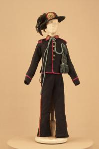 - NOTIZIE STORICO CRITICHE Il costume si completa con collo militare, polsi, ghette e buffetterie.\nGli spettacoli della Compagnia Carlo Colla che trattano il tema del brigantaggio nell¿Italia settentrionale e meridionale, erano in repertorio già dal 1863, come si evince dal libro mastro 1863-1879. I titoli erano "Majno della Spinetta", "I misteri del brigantaggio" e "I briganti della Callabria"(sic). Nel 1904 quest¿ultimo diventa "Caruso e i suoi briganti". Da questo spettacolo traggono origine nel 1907 l¿azione coreografica in 7 quadri "L¿umile eroe" con la musica di Corrado Gualtieri e nel 1918 "L¿asino e il Curato", commedia in due atti, entrambe a firma di Carlo II Colla.\nIl ballo "storico patriottico" "L¿umile eroe" rientra nei progetti di informazione sugli episodi storici che caratterizzarono la seconda metà dell¿800, tema trattato da tutte le compagnie marionettistiche di giro. Ad esso si affiancava l¿indagine sui fenomeni di trasformazione sociale che seguirono l¿età risorgimentale fra cui trova spazio il fenomeno del brigantaggio nell¿Italia settentrionale e meridionale. L¿ultima replica del ballo al Teatro Gerolamo di Milano risale al 1954.