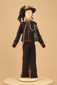 - NOTIZIE STORICO CRITICHE Il costume si completa con collo militare, polsi, ghette e buffetterie.\nGli spettacoli della Compagnia Carlo Colla che trattano il tema del brigantaggio nell¿Italia settentrionale e meridionale, erano in repertorio già dal 1863, come si evince dal libro mastro 1863-1879. I titoli erano "Majno della Spinetta", "I misteri del brigantaggio" e "I briganti della Callabria"(sic). Nel 1904 quest¿ultimo diventa "Caruso e i suoi briganti". Da questo spettacolo traggono origine nel 1907 l¿azione coreografica in 7 quadri "L¿umile eroe" con la musica di Corrado Gualtieri e nel 1918 "L¿asino e il Curato", commedia in due atti, entrambe a firma di Carlo II Colla.\nIl ballo "storico patriottico" "L¿umile eroe" rientra nei progetti di informazione sugli episodi storici che caratterizzarono la seconda metà dell¿800, tema trattato da tutte le compagnie marionettistiche di giro. Ad esso si affiancava l¿indagine sui fenomeni di trasformazione sociale che seguirono l¿età risorgimentale fra cui trova spazio il fenomeno del brigantaggio nell¿Italia settentrionale e meridionale. L¿ultima replica del ballo al Teatro Gerolamo di Milano risale al 1954.
