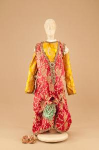 Costume femminile da nobildonna di foggia quattrocentesca composto da veste, sopravveste, cintura (con borsetta) e scarpe.