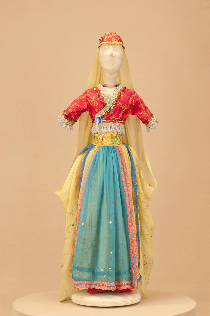 Costume folcloristico da ballerina indiana composto da pantaloni, gonna, bolero, cappello e velo.