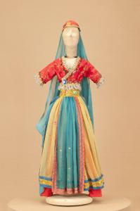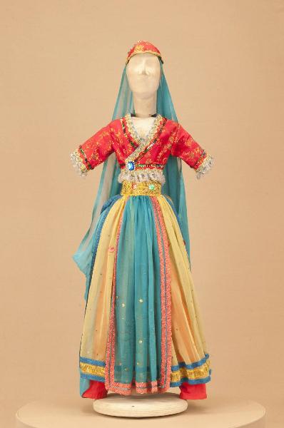 Costume folcloristico da ballerina indiana composto da pantaloni, gonna, bolero, cappello e velo.