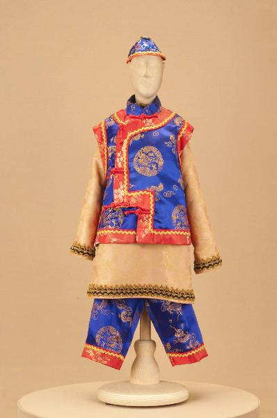 • NOTIZIE STORICO CRITICHE I pantaloni e la giubba, acquistati durante una tournè in Cina nel 2006, sono capi di abbigliamento infantile (ne è testimonianza l'etichetta) a cui sono stati aggiunti elementi decorativi. Il costume, che si completa con scarpe, è stato realizzato nel 2009 per il riallestimento de "La Lampada di Aladino", spettacolo che nasce come riduzione teatrale per marionette nel 1994. L¿argomento è tratto dalla fiaba "Aladino e la lampada meravigliosa", appendice della raccolta "Le Mille e Una Notte". Lo spettacolo di Eugenio Monti Colla, andato in scena in prima mondiale al Festival di Spoleto con musiche di Danilo Lorenzini, snoda il racconto in tredici quadri di ambientazione cinese come indicato nella fiaba d¿origine e narra l¿evoluzione del protagonista da giovinetto a uomo maturo attraverso vicende di carattere fantastico e simbolico.