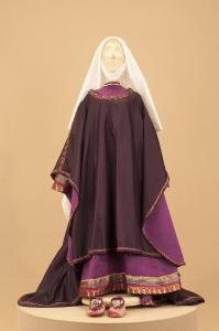Costume da nobildonna medievale composto da veste, sopravveste, soggolo, velo e scarpe.