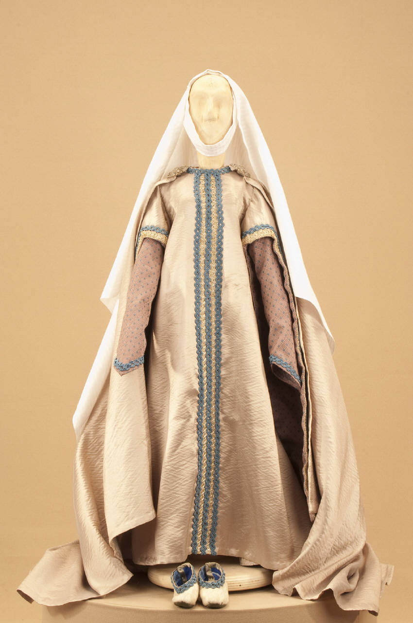 Costume da nobildonna medievale composto da veste, soggolo, mantello, velo e scarpe.