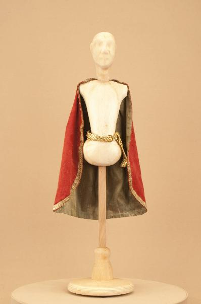 • NOTIZIE STORICO CRITICHE Il costume, che si completa con calzamaglia di cotone, con calze, cotta e cuffia in maglia di ferro, con polsi in pelle, è stato realizzato per "La Battaglia di Legnano", dramma lirico di Salvatore Cammarano con musica di Giuseppe Verdi andato in scena per la prima volta nel 1849 e per l¿apertura della stagione al Teatro alla Scala nel 1961 in occasione delle manifestazioni per celebrare il Centenario dell¿Unità d¿Italia, entra nel repertorio della Compagnia Marionettistica Carlo Colla e Figli nel maggio 1992, commissionata dalla cittadina lombarda in questione in occasione delle celebrazioni dell¿evento storico. Patria, onore, sacrificio di sé, libertà, si mescolano ad una vicenda amorosa di maniera dove, però, appaiono temi che in opere successive troveranno più ampio respiro. Per il riallestimento del 2012 al Piccolo Teatro di Milano, sono stati realizzati nuovi costumi, su ideazione di Eugenio Monti Colla e Cecilia Di Marco, e scene da Franco Citterio. I siparietti utilizzati sono siparietti storici, realizzati da Alessandro Colla nel 1932.