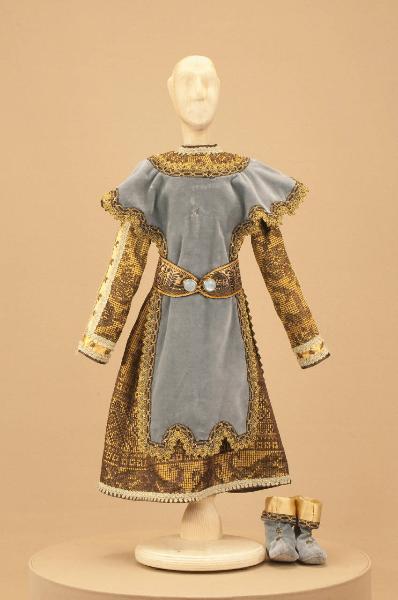 Costume da nobile medievale composto da veste, sopravveste, cintura e scarpe.