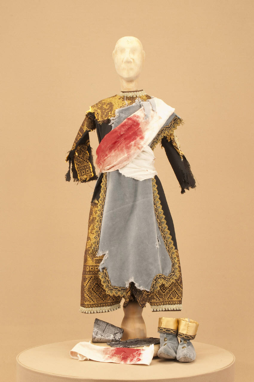 Costume da nobile medievale composto da veste, sopravveste, paramani, due bende insanguinate e scarpe.