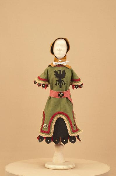 - NOTIZIE STORICO CRITICHE Il costume, che si completa con calzamaglia di cotone, con bracciali di pelle, con calze e maniche in maglia di ferro, è stato realizzato per "La Battaglia di Legnano", dramma lirico di Salvatore Cammarano con musica di Giuseppe Verdi andato in scena per la prima volta nel 1849 e per l¿apertura della stagione al Teatro alla Scala nel 1961 in occasione delle manifestazioni per celebrare il Centenario dell¿Unità d¿Italia, entra nel repertorio della Compagnia Marionettistica Carlo Colla e Figli nel maggio 1992, commissionata dalla cittadina lombarda in questione in occasione delle celebrazioni dell¿evento storico. Patria, onore, sacrificio di sé, libertà, si mescolano ad una vicenda amorosa di maniera dove, però, appaiono temi che in opere successive troveranno più ampio respiro. Per il riallestimento del 2012 al Piccolo Teatro di Milano, sono stati realizzati nuovi costumi, su ideazione di Eugenio Monti Colla e Cecilia Di Marco, e scene da Franco Citterio. I siparietti utilizzati sono siparietti storici, realizzati da Alessandro Colla nel 1932.