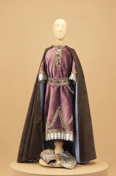 Costume da soldato medievale composto da veste, cintura, paramani e mantello.