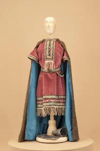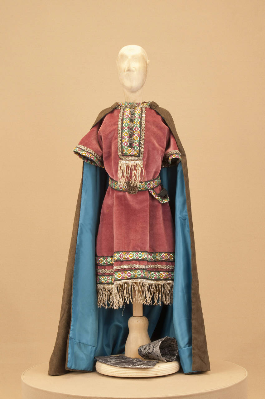 Costume da soldato medievale composto da veste, cintura, paramani e mantello.