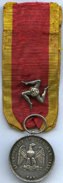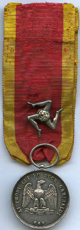 medaglia; nastro di seta rossa bordato di giallo all'estremo; simbolo metallico della Trinacria