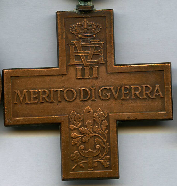 Croce al Merito di Guerra (Medagliere di Ildebrando Flores). "Merito di guerra" tra monogramma di Vittorio Emanuele III e gladio romano con serto d'alloro; stella raggiata a cinque punte