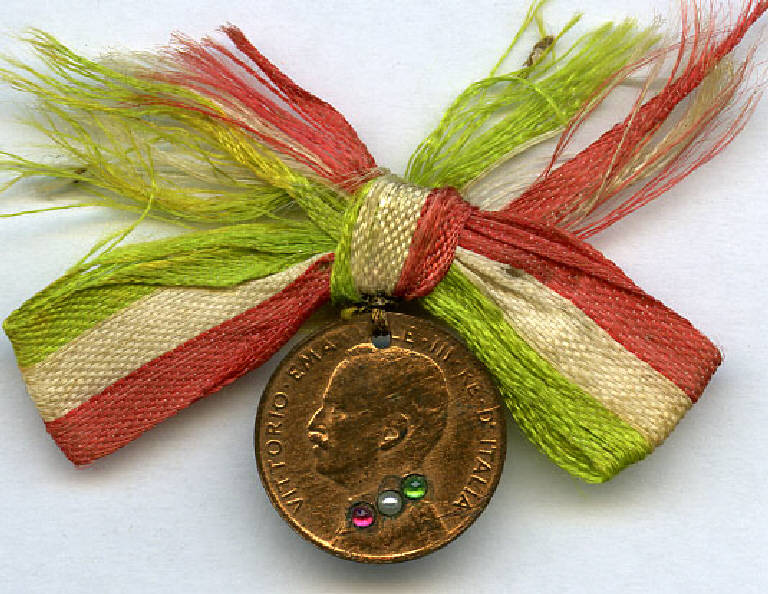 moneta con pietre rossa, bianca e verde applicate; nastro tricolore