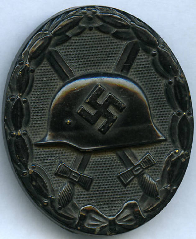 Distintivo delle Forze Armate tedesche per feriti della Seconda Guerra Mondiale. elmetto tedesco con svastica, spade e corona d'alloro