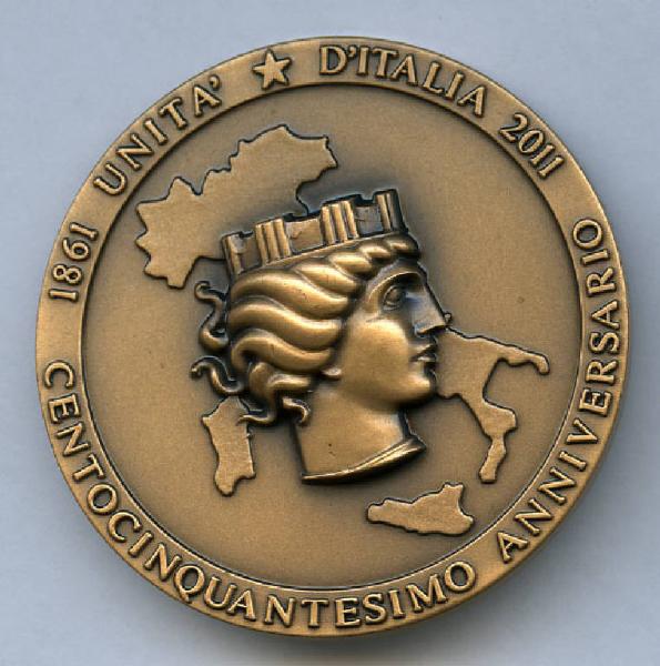Medaglia celebrativa del 150° Anniversario dell'Unità d'Italia. Profilo pianta d'Italia con Italia turrita