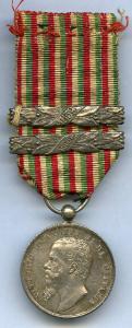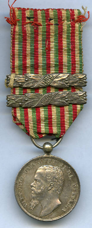 Medaglia; nastro a 18 righe verticali con tricolori della bandiera d'Italia; due fascette metalliche