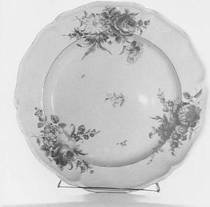 Il piatto ha bordo sagomato e orlato con riga d'oro puntinata, dipinti a mazzetti di fiori "au naturel". La differenza rispetto al modello originale si coglie soprattutto nella gamma cromatica sottotono.