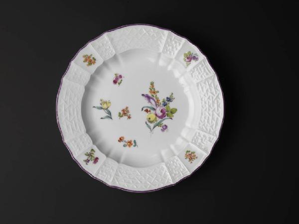 Piatto tipo "Brandenstein" con tesa che imita un intreccio in vimini, e parte piana dipinta con un mazzo di fiori "au naturel".