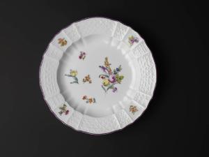 - NOTIZIE STORICO CRITICHE Il piatto in esame, che non mi risulta inventariato prima del 2011, è stato individuato in un armadio della biblioteca insieme al n. H 528 ed è stato per la prima volta considerato da I. Del Palma 2011 nell'ambito della revisione delle porcellane dell'Accademia Tadini. Come ha notato la studiosa, il piatto rientra tra i prodotti di manifattura tedesca realizzati secondo i modelli elaborati a Meissen. Lo conferma, in questo caso, l'adesione al modello detto "alt ozier" (che presenta la tesa decorata con un motivo in vimini intrecciati) e il decoro che prevede fiori fiori "au naturel" dipinti su tutta la superficie, cui si aggiungono degli insetti che vengono anche ripetuti sul retro della tesa, forse per coprire alcuni difetti di fusione.\nMarco Albertario