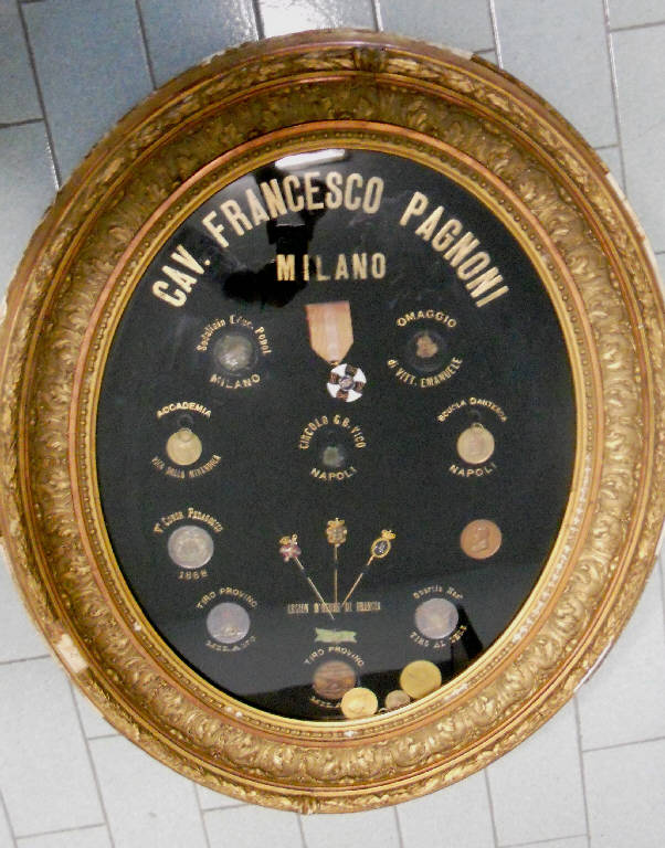 - NOTIZIE STORICO CRITICHE Il medagliere pervenne, presumibilmente, con il legato di Francesco Pagnoni (1877). \nIl Cavalier Francesco Pagnoni, titolare di una delle tipografie più affermate della Milano post unitaria, lavorò per numerose case editrici. Nel 1873 istituì un collegio tipografico annesso alla propria impresa in cui lavoravano molti Martinitt dell'Orfanotrofio Maschile.\nNella quadreria dell'Ente si conservano anche un suo ritratto, il ritratto della sorella Francesca, quello della figlia Luigina morta a diciassette anni e la rappresentazione dell'inaugurazione del suo collegio tipografico.
