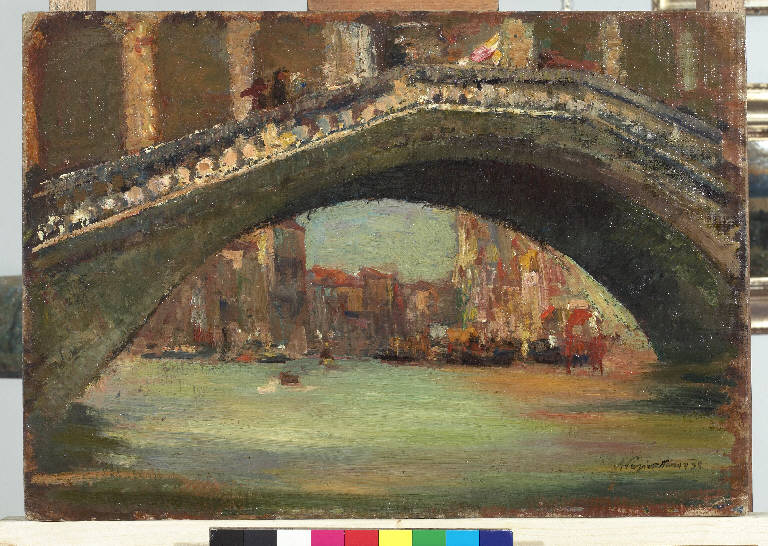 - NOTIZIE STORICO CRITICHE Il ponte di Rialto incornicia uno scorcio prospettico ravvivato dai toni aranciati dei riflessi sull'acqua.