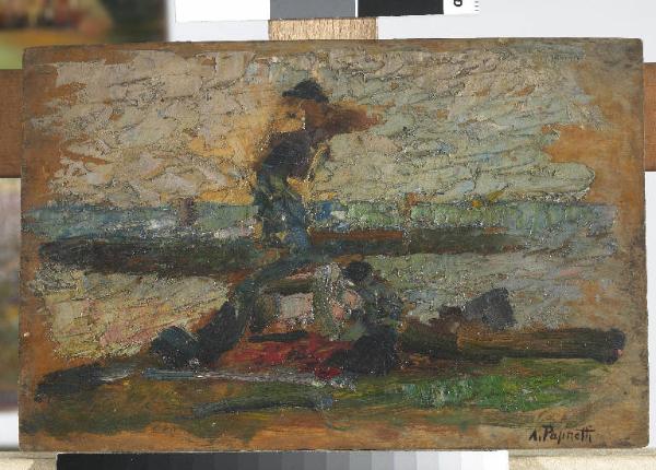 - NOTIZIE STORICO CRITICHE Le dense spatolate e i pochi tratti di pennello suggeriscono semplicemente la silhouette indefinita delle figure umane ed è il titolo "Pesaro. Carpentieri" a confermare la loro presenza. Anche in questa tavola Antonio Pasinetti sperimenta l'esecuzione rapida di un bozzetto en plein air.